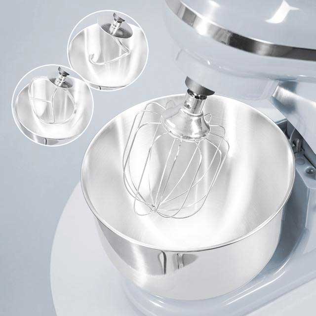 Uno de los aspectos destacables de esta amasadora es su estética retro, con detalles cromados que aportan un toque clásico a cualquier cocina. Su bol de acero inoxidable de 5 litros permite trabajar con grandes cantidades de masa, siendo ideal para preparar recetas familiares sin necesidad de dividir las mezclas en varias tandas.
